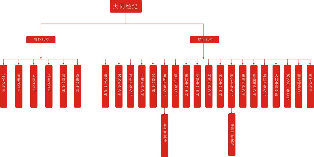 2014年,大同經(jīng)紀(jì)資產(chǎn)重組后,在省政府及各職能部門的全力支持下,高點(diǎn)起步,快速布局,在全省各市州設(shè)立了分支機(jī)構(gòu),形成了在全省范圍內(nèi)通行達(dá)業(yè)、通城達(dá)鎮(zhèn)、通鄉(xiāng)達(dá)村、通街達(dá)巷的城鄉(xiāng)經(jīng)紀(jì)服務(wù)網(wǎng)絡(luò)。我們已根植湖北并走向全國:下轄28家機(jī)構(gòu),其中湖北省內(nèi)分公司18家,省外分公司6家,省內(nèi)營(yíng)業(yè)部 4 家。