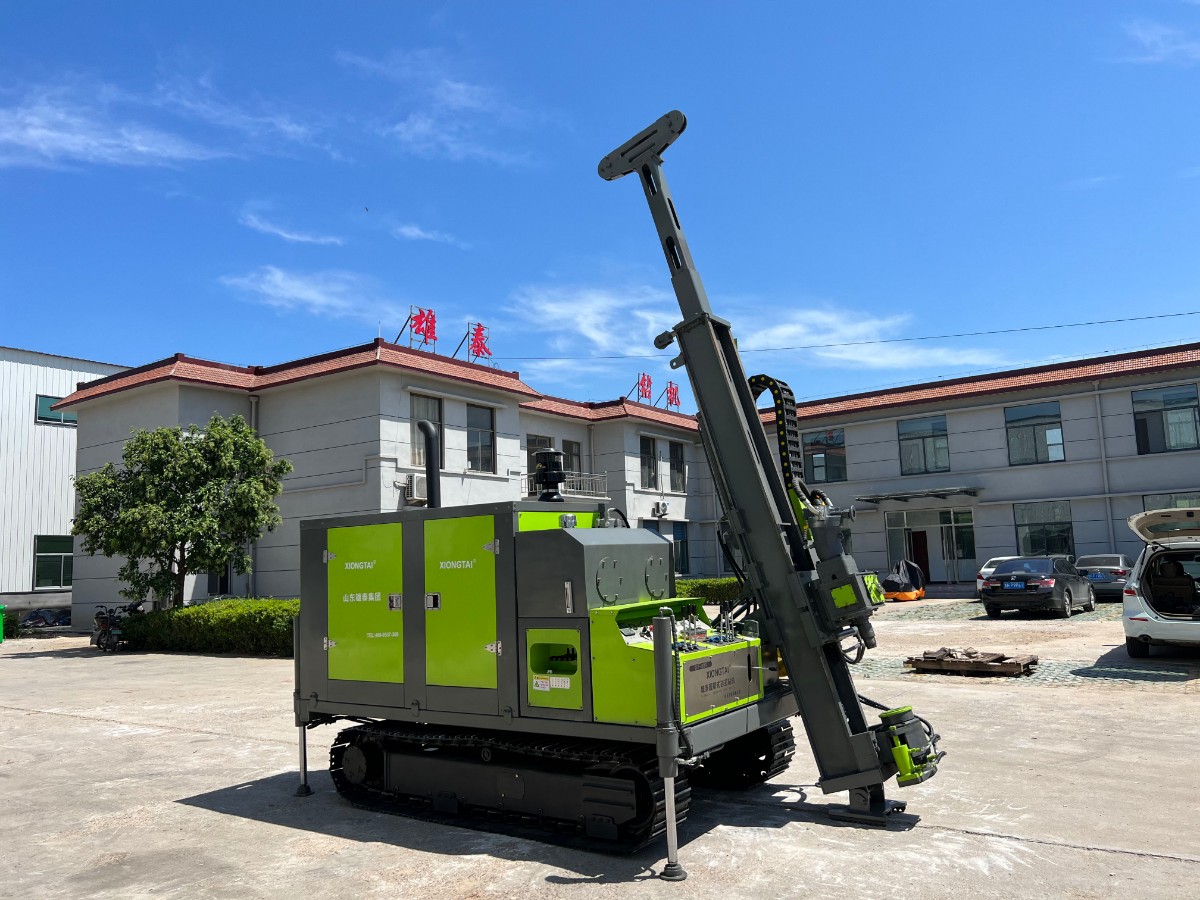 山東雄泰集團自主研發(fā)生產(chǎn)的履帶式全液壓鉆機的無線遙控行走、液壓桅桿自動升起,動力頭自動左側(cè)移機提鉆為該款鉆機一大特色。其中桅桿自動升起,動力頭移機為我公司實用新型專利,極大緩解了現(xiàn)場施工的難度,有效減小了鉆機施工人數(shù),節(jié)約了成本,該履帶式全液壓鉆機分別采用76KW/115KW發(fā)動機,動力強勁,扭矩大,適用于各類復(fù)雜地層的金屬礦開采。